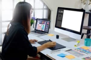 従来は、お店のモニターや印刷紙数パターンのシミュレーションしか見ることができませんでした。本部デザイナーのご提案プランとご自身のスマホやPCでいつでもどこでも好きなようにシミュレーションができるシステムをご用意しています。