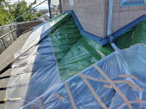 電線や瓦にも塗料が飛ばない様、養生します。瓦にはしっかりスベラーズしていきます。その名の通り、転倒転落、事故防止のためのすべり止めテープです。