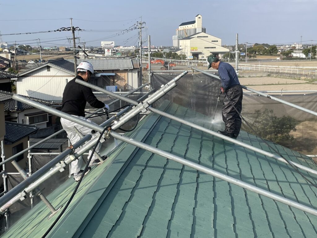 さあ高圧洗浄が始まりました。長年のコケや汚れ、鳥の糞、サッシ廻りのごみ、っ土間の清掃一斉に洗い流します。