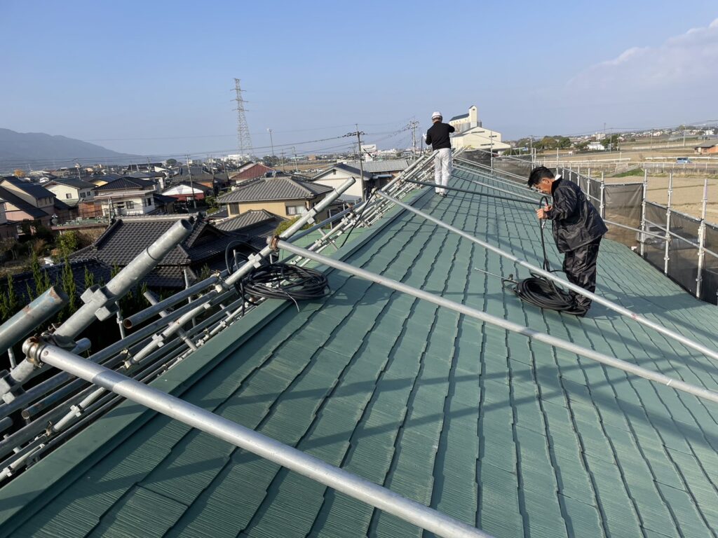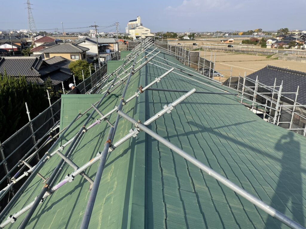 南面は急こう配なので屋根足場を組ませていただきまた。職人も安心して作業ができるよう