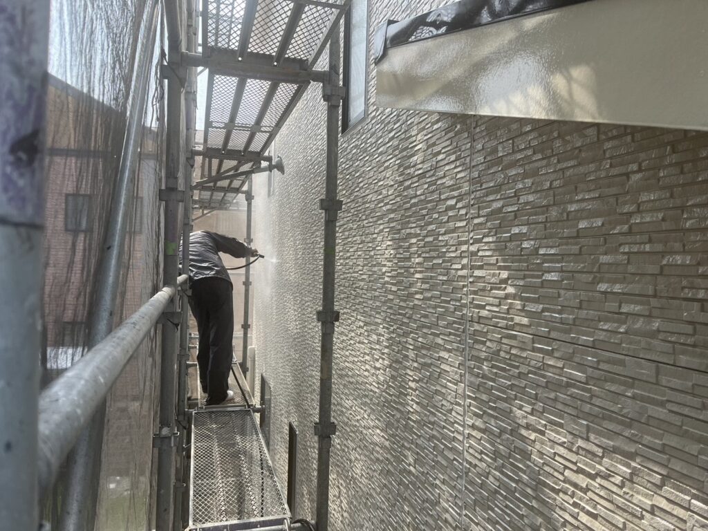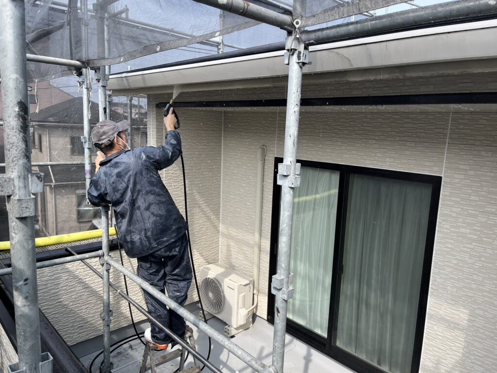 A. 外壁にはホコリ、カビ、コケ、チョーキング粉、排気ガス、雨だれなどの汚れや劣化物質がたっぷりついてます。そのまま塗料を塗っても、汚れの上に塗ることになる=塗料が壁に密着せず、汚れと一緒に塗膜が剥がれ落ちてしまうからです。