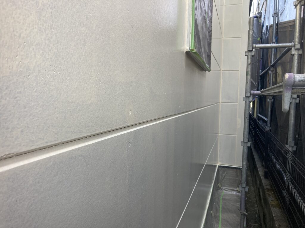 写真をご覧いただくと分かるように、中塗り完了後の外壁は、