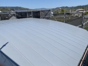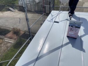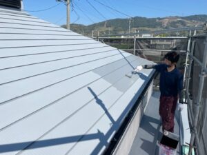 次は上塗りです。ファイン4Fルーフ フッ素樹脂のサーフグレー 色で塗装させていただきました。☀️暑さ対策です!!ペイントホームズ 久留米中央店ではフッ素樹脂で塗装することが多いです!!