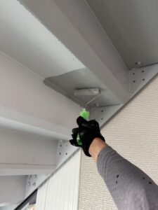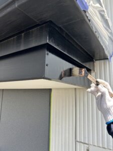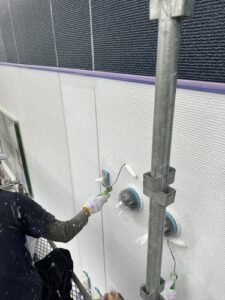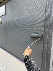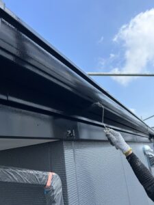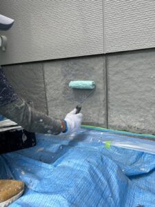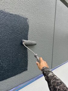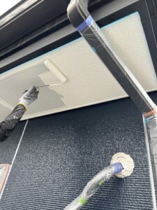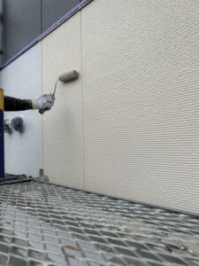 外壁塗装上塗り作業中です。こちらはパーフェクトトップ N-40です。高耐久塗料です。